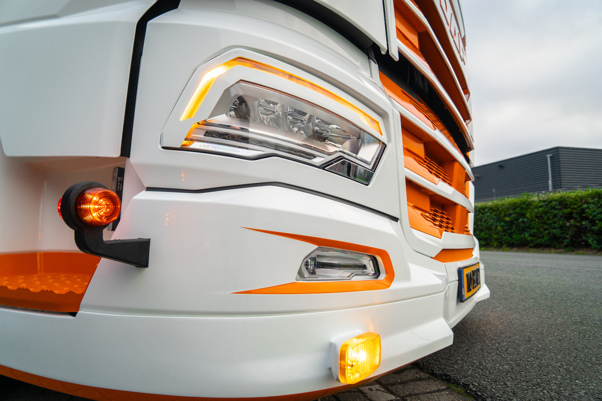 To make this DAF XG+ really stand out, we opted for a striking color scheme. The grille, fenders, wheels, and additional accents of the truck were all painted in a bold Ford Focus ST Orange Metallic. The vibrant color contrasts beautifully with the truck's steel body, making it a real eye-catcher wherever it goes.