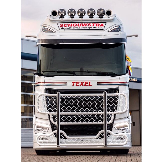 Solar Guard Exclusive Truck Parts presenta el Parachoques delantero reforzado Hypro fabricado para DAF XG y XG+. Está construido en aluminio ligero y pesa unos 35 kg. El diseño tiene como objetivo un frente limpio y sólido que sigue las líneas originales del camión. Se obtiene una alineación limpia sin huecos y una pieza que se conecta como debería de fábrica.